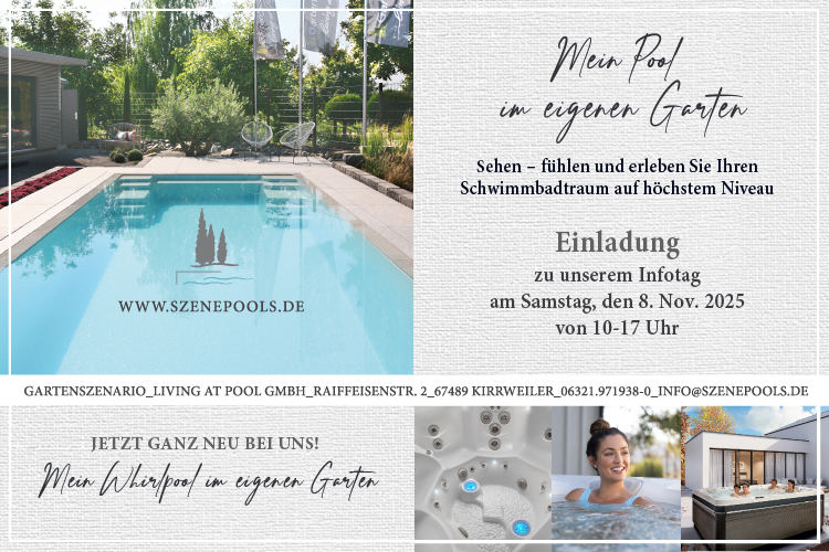Sie träumen von einem eigenen Swimmingpool im Garten? Mit einem Pool oder einem Whirlpool holen Sie sich mehr Lebensqualität, Komfort und pures Urlaubsfeeling nach Hause. Wir von GartenSzenario – living at Pool sind Ihr Partner für die professionelle Gestaltung von Swimmingpool- und Wellnessanlagen nach Ihren Wünschen. Als Familienunternehmen aus Kirrweiler (Rheinland-Pfalz) mit langjähriger Erfahrung betreiben wir Poolbau aus Leidenschaft. Gerne gestalten wir auch Ihren persönlichen Traumpool. Tauchen Sie mit uns ein und genießen Sie den Luxus unserer hochwertigen Compass-Carbon-Ceramic-Pools und unwiderstehlichen Caldera Spas!